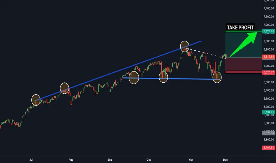 SPX500 is in a clear upwards channel and has broken the last bit of resistance (white trendline line shown) - this is a clear confirmation that the next target will be the next resistance zone to the upside shown above (this is a great buy trade opportunity) - Time to buy!
