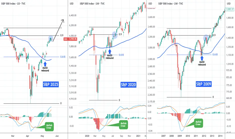 On their respective 0.9 Fibonacci levels (close to which we are today), both of those market recoveries went straight to new ATHs, without testing their MA50 (blue trend-line) until the next Cycle peak. They had that tested before when the price was trading near (or on)the 0.618 Fib. Notice also how a MACD Bullish on all three charts, confirmed the aggressive recovery pattern straight after the bottom.