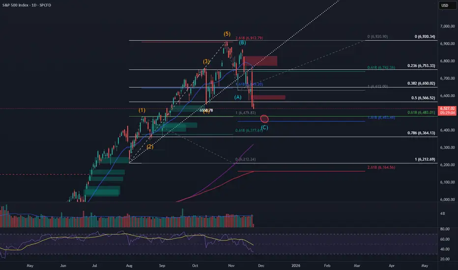 The S&P 500 appears to be completing an A–B–C corrective structure following the recent top. Price is currently breaking below wave (A) and moving toward a strong confluence zone at the 0.618–1.618 Fibonacci levels. This area aligns with prior demand, trendline support, and measured targets, making it a potential reversal zone for wave (C). Watching for bullish reaction or confirmation before considering upside continuation.