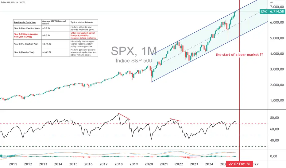 Este segundo año del ciclo presidencial suele ser el más débil de los cuatro y el más propicio para una consolidación importante del S&P 500 — lo que en este ciclo corresponde a 2026.