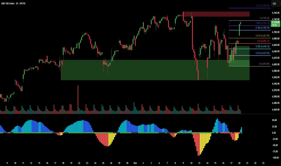 SPX has been climbing steadily off the mid-October demand base near 6,600–6,620, an area that absorbed multiple downside attempts over the past week. The current advance has now retraced the prior swing decline almost in full, reaching into the 0.886–1.0 Fibonacci zone near 6,720–6,736.
