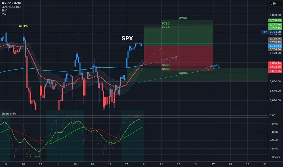 Alway’s know where your 35EMA is. It is underneath the implied move right now, which means tomorrow has a high probability of being flat or down. ATH’s are in tomorrow’s range above us, and 35EMA underneath us with that 30min 200 and also the bull gap from open as well… let’s go…