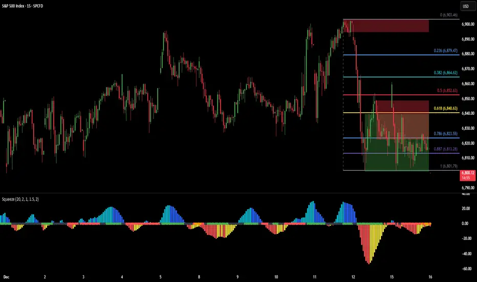 This 15-minute SPX chart provides a structural view of price action for December to date, focusing on range behavior, Fibonacci context, supply/demand interaction, and volatility conditions rather than directional prediction.