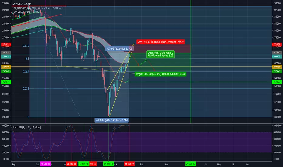 We have seen the S&P 500 fail to stay above the 100 day EMA repeatedly, now the market has run up 14% since Christmas. While the bottom may be in, in the near term one should expect to see a technical pullback. There is a very large and very ominous wedge encompassing the entire recovery move and the Stochatic RSI has been overbought for four sessions.