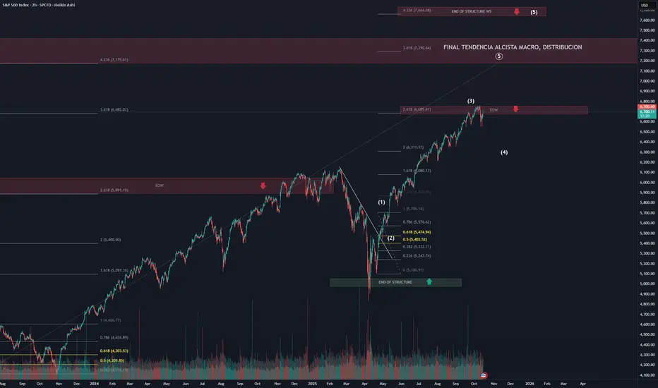 Our analysis of this index suggests that we are currently in the development of a Wave 4 (W4) within the last bullish substructure of the macro fifth wave, where, in the long term, we could potentially see the end of the trend between the 7100 and 7600 levels.