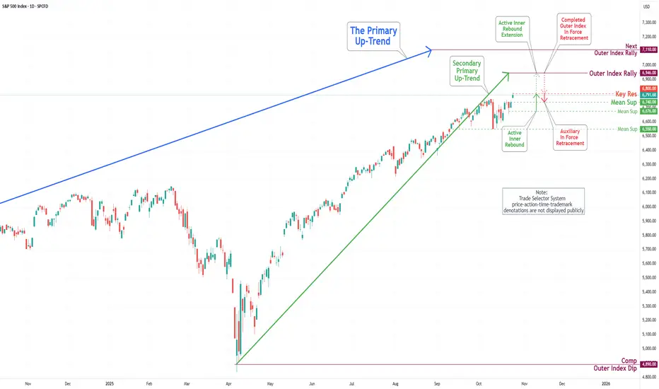 At present, the index is situated at the newly established Key Resistance level of 6800, which lies just below the historical high of 6807. This positioning indicates the potential for further upward momentum, as the prevailing trend suggests a well-structured Active Inner Rebound extension toward the Next Outer Index Rally target of 7110.