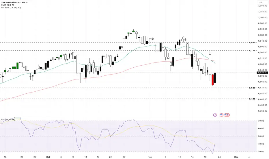 The US Federal Reserve policy is now in sharp focus, with remarks from policymakers supporting expectations for a possible interest rate cut in Dec, which is inspiring a slight rebound and giving traders hope for year-end support. Fed New York President Williams said the central bank has room to cut rates again soon as the labor market softens, which improved sentiment. Recent strong US earnings, including from key US 500 members, have offered some relief but have not reversed the current downward trend as AI-driven enthusiasm cools. Renewed fiscal uncertainties, increasing debt issuance, and mixed economic data have weighed on sentiment.