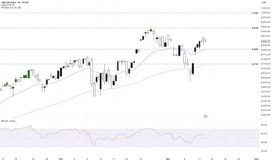 The index is in a well-defined upward channel, with dynamic support at the EMA 21. The RSI is bullish but nearing overbought territory, though all major moving averages signal a "buy." Short-term volatility (VIX) is low, supporting a continued grind higher. Key levels are 6,805 Support and 6,920 Resistance.