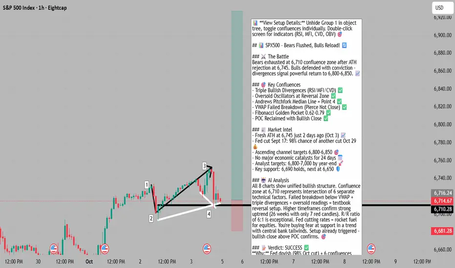 Here's what all this means in simple terms: The S&P 500 just hit a new record high 2 days ago at 6,745, then pulled back to 6,710 - about a 0.5% dip. This is completely normal and healthy in an uptrend. The Federal Reserve (the people who control interest rates) just cut rates and is highly likely to cut again in 3 weeks. Lower interest rates are like rocket fuel for stocks because they make money cheaper and drive investors into equities. Your technical setup caught this pullback at the exact right spot - multiple indicators show the selling is exhausted and buyers are stepping back in. The big picture: we're in a strong uptrend with the central bank on our side, you're buying a small dip at strong support, and the path of least resistance is back up to 6,800-6,850. The risks? Market is a bit overbought on bigger timeframes, but in strong trends that can persist for a while. No major scary news on the horizon that would crash the market. This is a high-probability bounce setup in favorable market conditions. 🎯