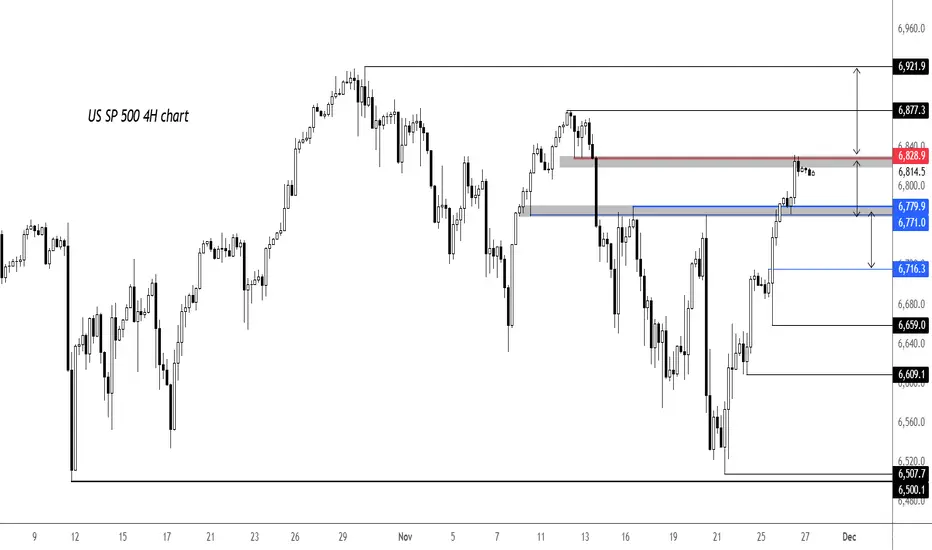 Following the big recovery, lots of short-term levels have been reclaimed this week but with US markets closed today, index futures have been fairly quite and easing back down ever so slightly. Key support is now seen around 6771-6780 on our US SP 500 chart (derived from the underlying ES prices). Below that, 6716 is the next support. Bulls will get in trouble if 6659 - most recent low - breaks. On the upside, 6829 is first hurdle, marking the point of origin of the previous drop. Ideal location for the bears to step back in if they want to regain control of price action. Lose that, 6877 is next upside target then the all time high at 6922.