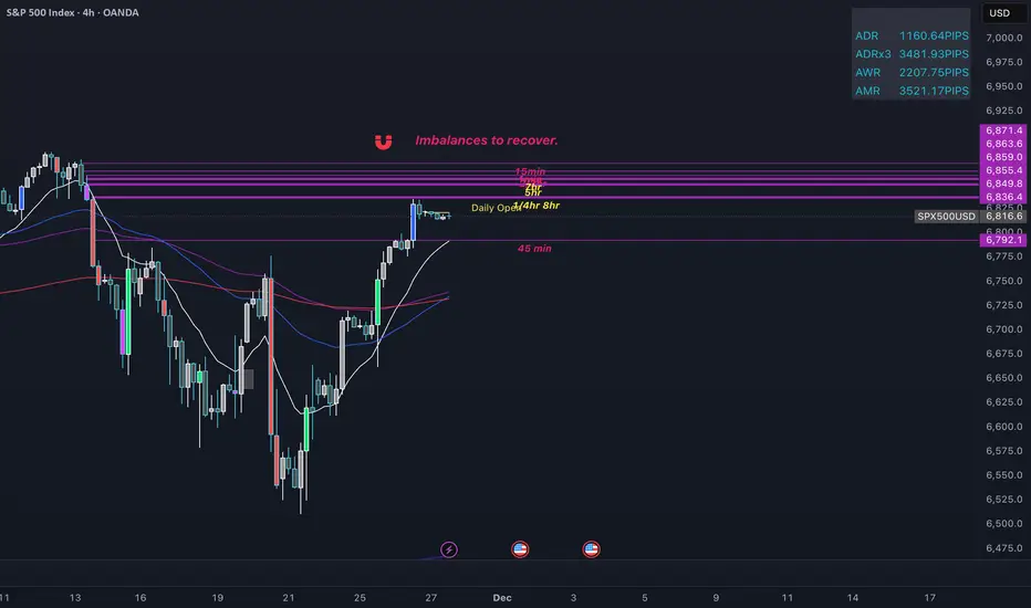 SPX500 has pushed higher since the last update and is now consolidating just below a significant cluster of unfilled imbalances (vector candles) spanning multiple timeframes — 5min, 15min, 1hr, 2hr, 4hr, and 8hr.