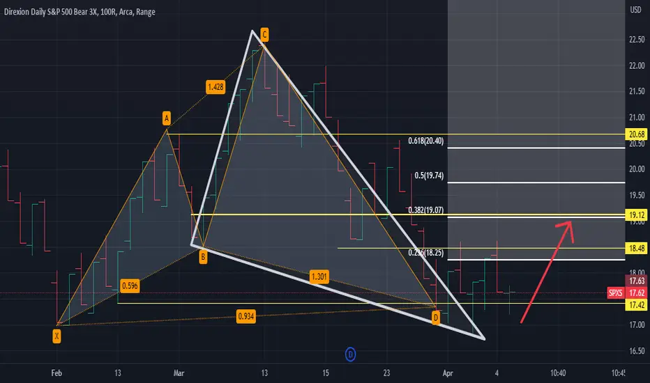 adding this morning as I anticipate sp500 futures along w/ spy to sell off the rest of this week. im looking for B leg retrace on the bullish cypher near the .382 fib level