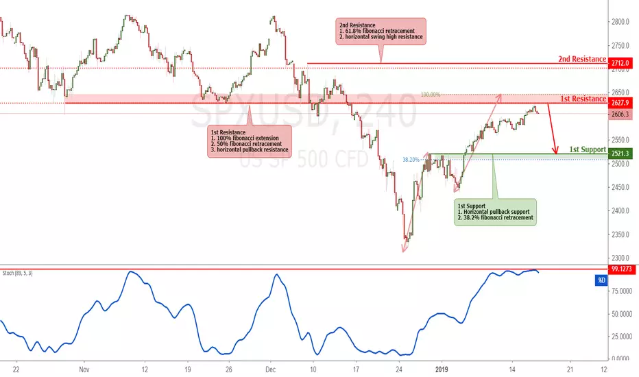 SPXUSD is testing our first resistance at 2627.9 (horizontal pullback resistance, 50% fibonacci retracement , 100% fibonacci extension ) where a strong drop might occur below this level pushing price down to our major support at 2521.30 (horizontal pullback support, 38.2% fiboancci retracement).