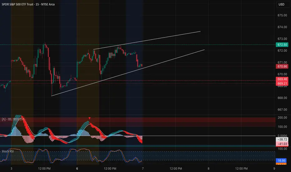 SPY is holding a clean ascending channel structure, consolidating near $670.66 after a mild pullback from the upper resistance zone around $672.50. This intraday pattern shows controlled bullish momentum with shallow retracements — a healthy signal for trend continuation if buyers hold the lower channel.