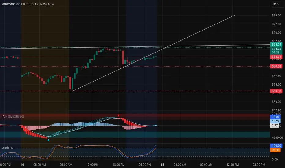 SPY had a clean bullish run early today with consecutive CHoCH → BOS confirmations, pushing toward 665–667 before sellers reacted sharply. That rejection created a fresh CHoCH to the downside while price is now retesting the broken structure near 663–665. The ascending trendline from the morning impulse is still intact, but momentum is fading. MACD histogram shows weakening bullish pressure with a soft cross, and Stoch RSI has cooled from overbought. This suggests indecision before the next leg.