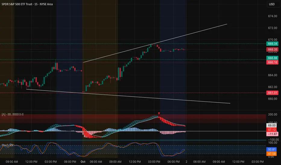 SPY ripped higher into the 668–669 zone, testing the upper channel before momentum started cooling. On the 15-min chart, MACD has rolled over into red, while Stoch RSI is mid-range after pulling back from overbought.