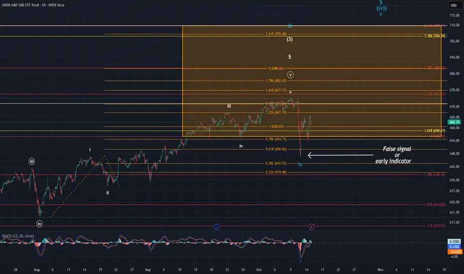 The simplest way I can explain this, is the overlap in SPY could potentially be looked at like an error. If this is the case, then the turquoise labeling on the chart should come to pass and we should ideally see price target the $680 - $710 area. If it is an early indicator that the SPX is all but done, it may not get another high and begin moving lower very soon.