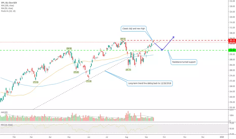 Notice the bearish engulfing candlestick today, after the doji yesterday? I believe that means we are going back down to retest the green line I drew in the 295 area. We just made new highs, but could not close above the highest close level set in July. I do not believe this sell-off will be anything more than simple profit taking after this nice rip up after breaking through consolidation. More or less, I think this will be just a breather ... UNLESS, negative trade war news comes out.