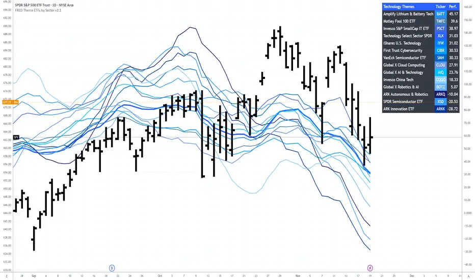 This indicator compares the performance of multiple Theme ETFs and presents their relative movements on a single chart. It helps visualize rotation flows, leadership changes and the evolution of ETF groups over time. Useful for understanding how different investment themes behave in various market environments.