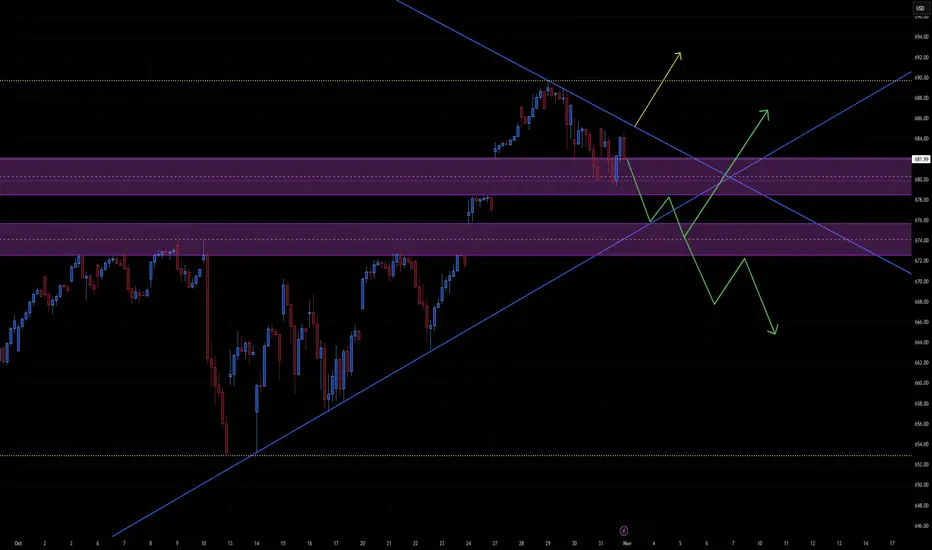 Price currently around 681–682, testing the upper supply zone and descending trendline.