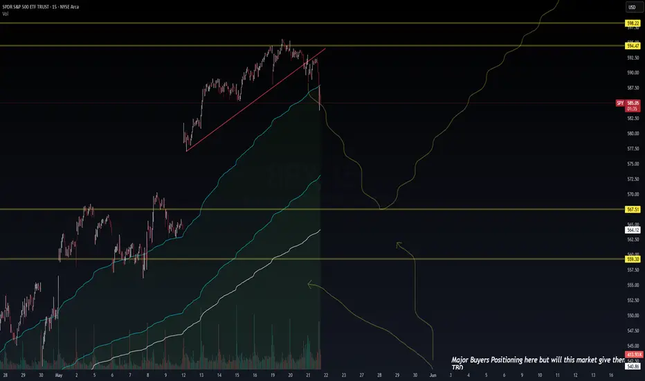 A textbook ascending wedge breakdown has triggered intraday, breaching dynamic support right at the edge of the VWAP envelope. This breakdown aligns with a higher time-frame rejection seen near 598.22 (0.886 retrace zone).