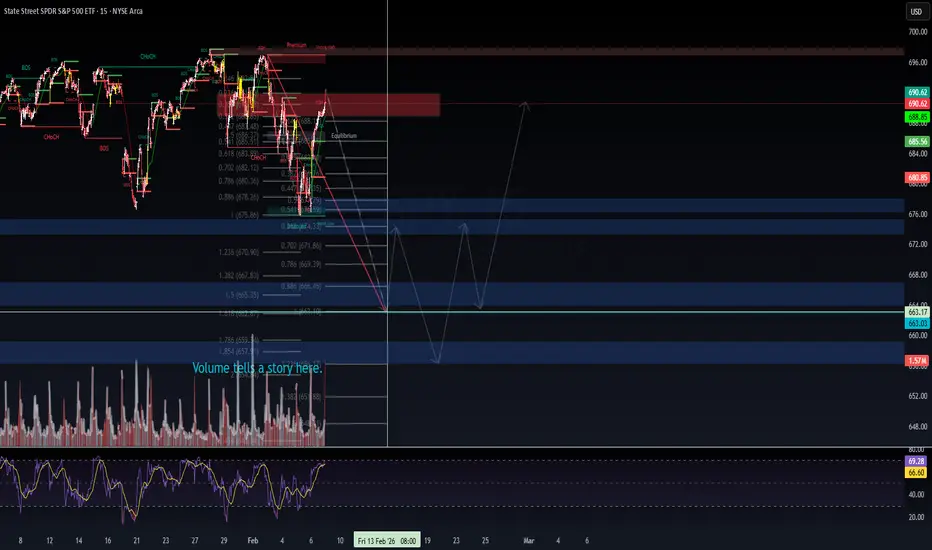 Volume tells the story: distribution on sell candles into the Feb 4 low, weaker volume on the bounce back to $690. This is a liquidity grab, not trend continuation.