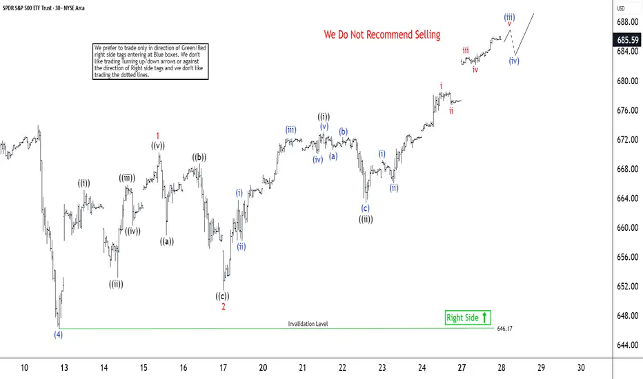 The short-term Elliott Wave analysis for the S&P 500 ETF (SPY) indicates an ongoing bullish cycle that began at the April 2025 low, unfolding as a five-wave impulse structure. As shown in the 30-minute chart, wave (4) of this impulse concluded at 646.17. The final leg, wave (5), is currently underway, characterized by an internal five-wave structure with nested subdivisions. From wave (4), wave ((i)) peaked at 665.13, followed by a pullback in wave ((ii)) to 653.17. Wave ((iii)) then advanced to 665.83, with a subsequent dip in wave ((iv)) to 660.28. The final wave ((v)) reached 670.23, completing wave 1 on a higher degree.