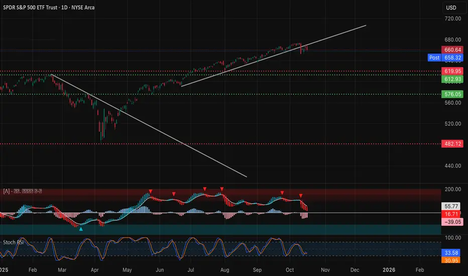 On the 15-minute timeframe, SPY shows a tight descending channel with multiple CHoCH → BOS prints confirming lower-high structure. The MACD histogram has slightly flattened near zero, indicating short-term indecision after extended downside. Meanwhile, Stoch RSI is curling upward from oversold — suggesting a brief relief bounce before sellers step in again.