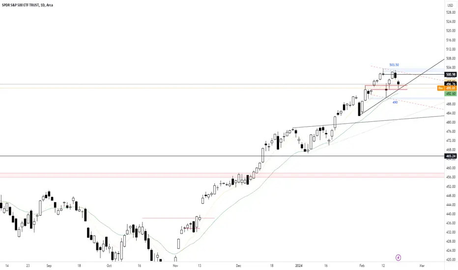 Scenario 2. SPY going lower onto the next support - 21EMA, then 490-488 as pivots + Channel (flag) bottom.