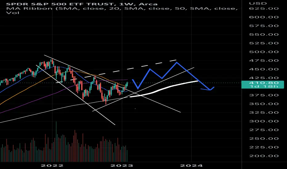 Seems to have broken out of decending triangle.. could be an opportunity to bounce into the 430’s June/July. Delaying any recession news and pumping “soft bottom” articles. Transitioning from put to call dominant late into August. Triggering a large outflux and negative news dump, easily sliding down into the 360’s to print puts.