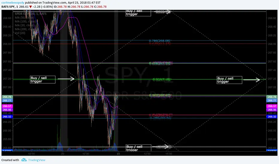 SPY 1 Min model with current trading range buy sell triggers, fibs, quads, moving averages Apr 23 246 AM SPXL SPXS