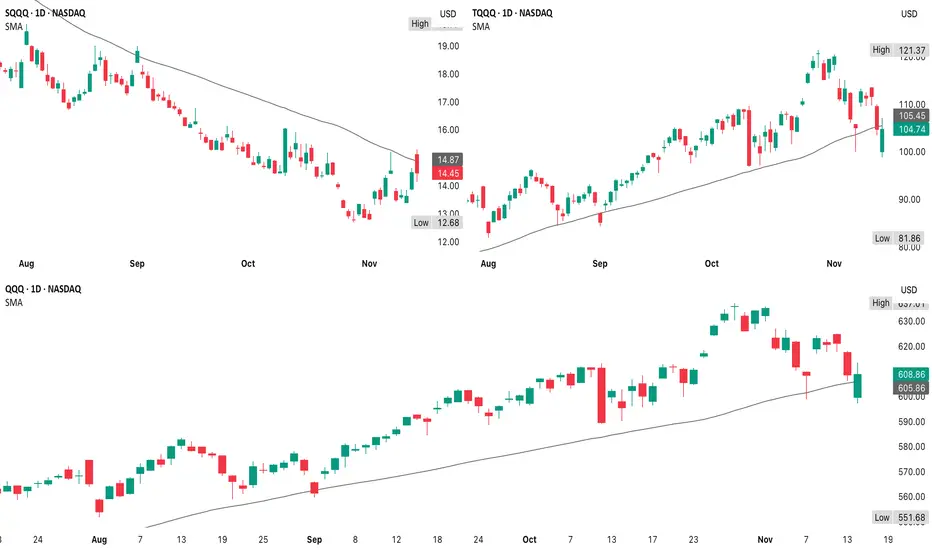 • If QQQ drops from ~$610 to ~$588 (-3.6%), SQQQ gains 10.8% on the move from ~$14.50 to ~$16, which is a realistic target