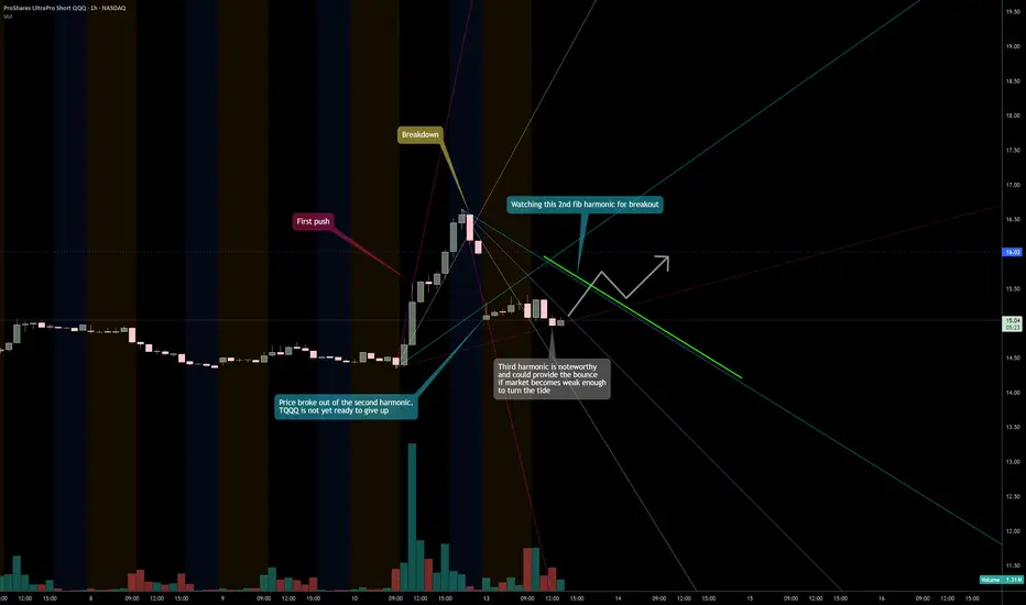 The fib lines are saying we're mixed right now, and the long bull run may be turning. I'm closely watching the 2nd harmonic of the fib fan for SQQQs break to the upside.
