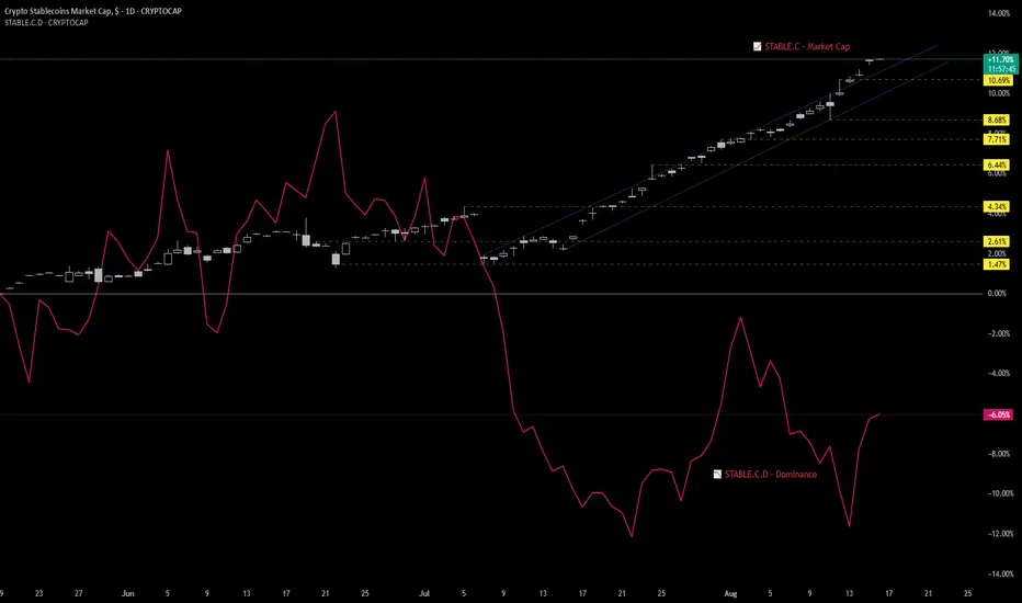 With the rise of regulated stablecoins—and new TradingView tickers like CRYPTOCAP:STABLE.C (Stablecoin Market Cap) and CRYPTOCAP:STABLE.C.D (Stablecoin Dominance)—we now have real-time, on-chain liquidity metrics that better reflect how institutional and retail capital enters the crypto ecosystem.