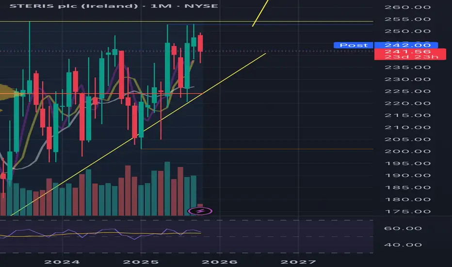 "STERIS plc (STE) monthly chart shows a classic bullish setup: after a strong long-term rally, the stock formed an ascending triangle pattern with rising lows and a strong resistance above. If