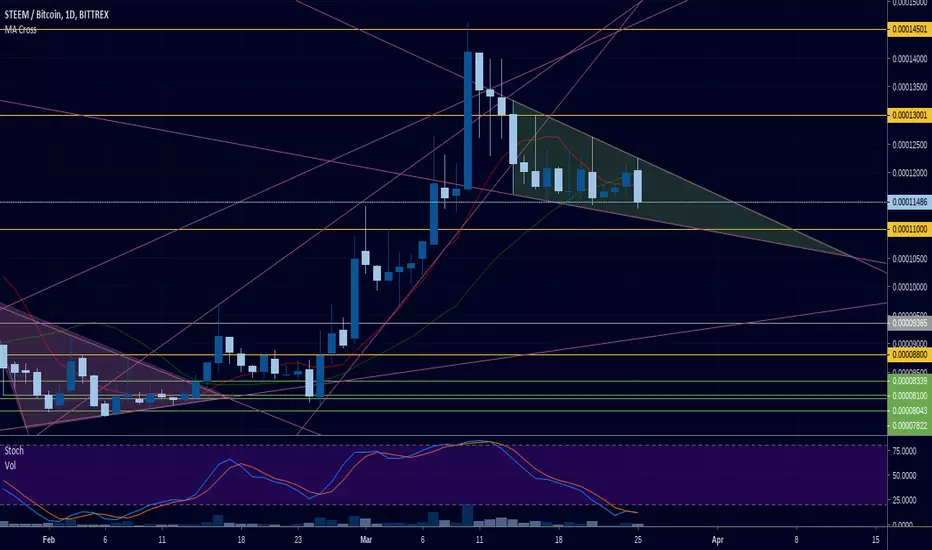 It is currently in a descending wedge which in my opinion will test support level and looking at possible dates it might happen end next week closing on March 31st where the 11k satoshis level will be tested and rejected and continue moving along the wedge. New move will probably happen before April 13th where the long running descending wedge will no longer be valid or will have to be adjusted if there is no break above or below the support and resistant levels.