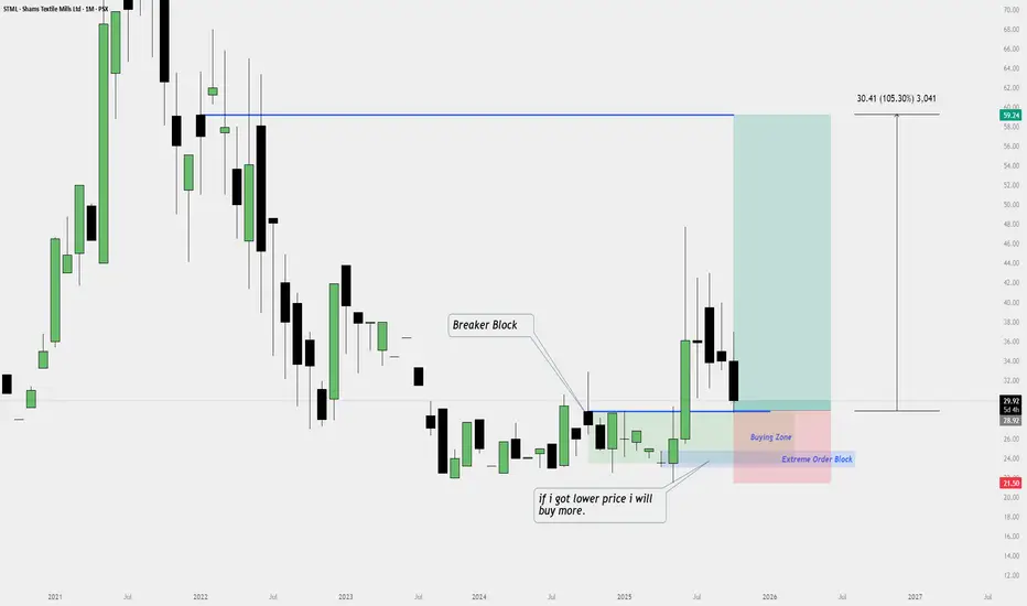 Shams Textile Mills has confirmed a bullish shift after breaking structure above the previous consolidation range. The monthly chart shows a clean breaker block that acted as resistance earlier and is now turning into a potential support zone.