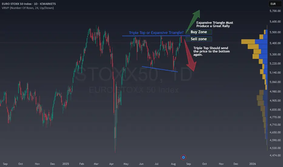 Today’s EURO STOXX 50 chart puts us right in the middle of a classic trader’s dilemma, triple top versus expansive triangle.