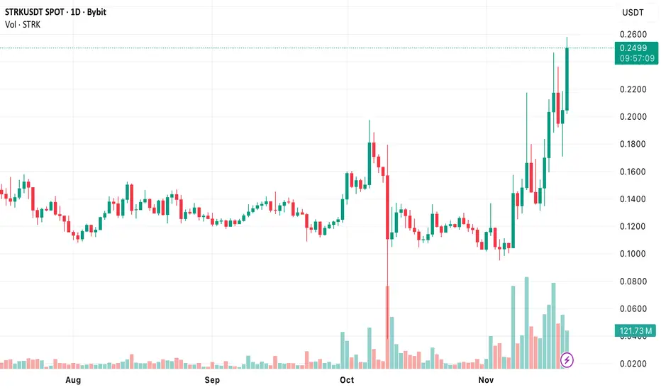 Over the past 24 hours, STRK traded between 0.2321–0.2459, with the latest close at 0.2417, well above yesterday’s 0.1911. Rising volume supports the move, while market cap is now $1.09B.