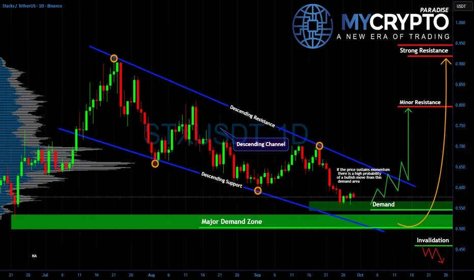 💎#STXUSDT has been stuck in a clear descending channel, repeatedly rejecting from its resistance line and finding temporary relief at its support. Now, price is testing a major demand zone between $0.55–$0.58, a level that could either spark a strong reversal or lead to brutal breakdowns if demand fails.