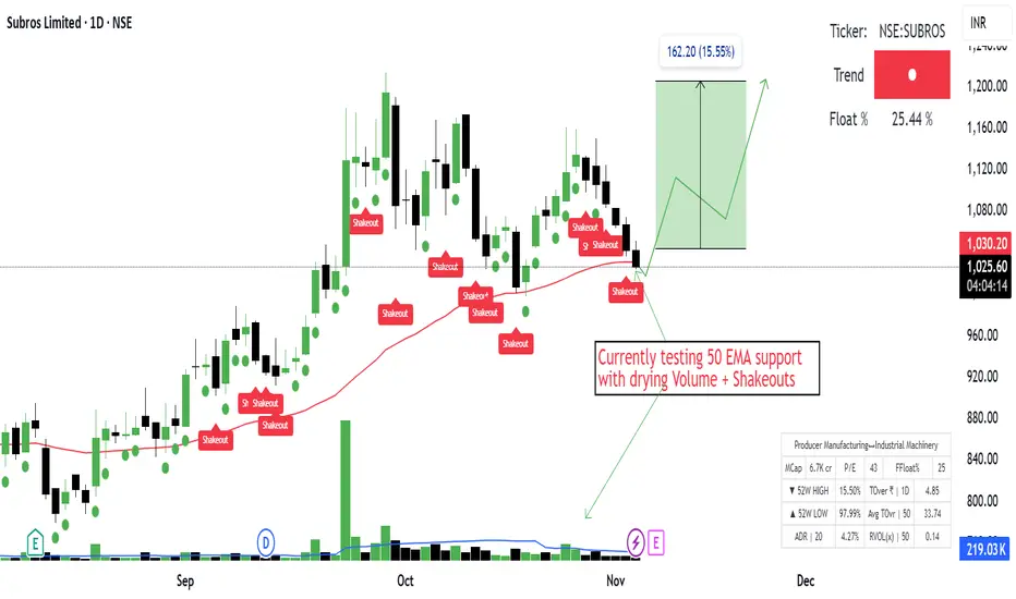 Subros is currently holding near its 50 EMA, forming a potential reversal base after multiple shakeouts. The price action shows healthy absorption with drying volumes — a classic sign of selling exhaustion.