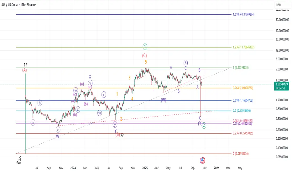SUI bullish price action stalled when it failed to break higher in September, putting an end to a series of 1/2 moves to bed then crashing into the October low. The actual low is debatable, but Binance seems to have gotten hit the hardest, so let's go with that. Now the 5 wave moves in between seem to be parts of a and C waves of various degrees. Depending on how the next price action unfolds, there could be 2 bullish options.