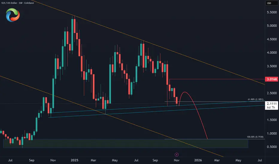 SUIUSD continues to respect the channel from October 2024, currently finding support near the 61.8% Fibonacci extension zone. This area could still fuel a bounce this month, offering short-term relief.
