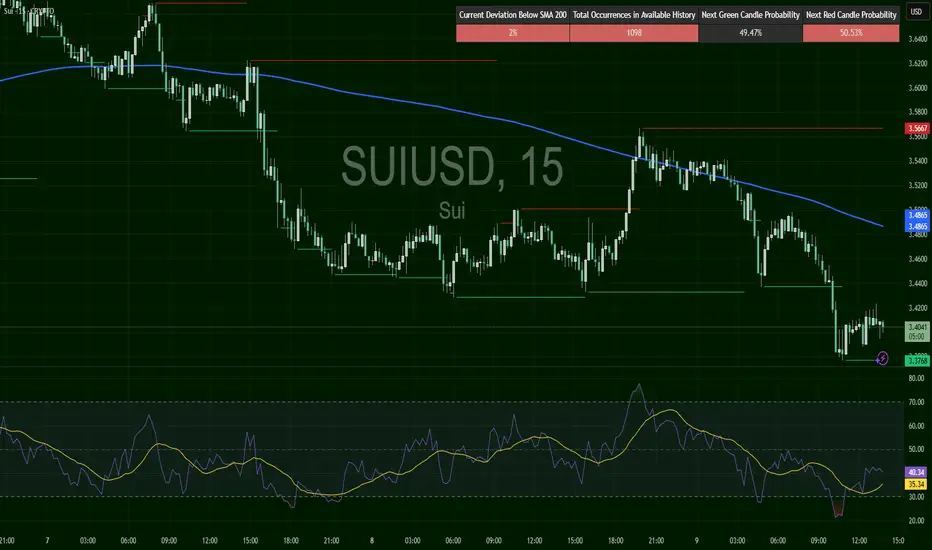 Sui trades at $3.40, holding near $3.38 support. RSI 39, showing limited recovery from oversold conditions. Resistance at $3.57.