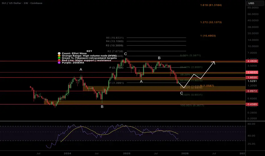 Price is falling below the S1 pivot, bringing up the next target of the golden pocket and High Volume Node. There is no weekly 200EMA. The series of macro ABC’s suggests upside targets may be limited to the R3 pivot.