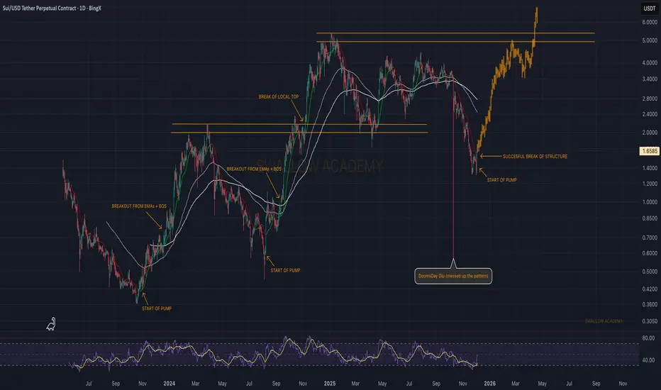 SUI has repeated the same pattern multiple times: breakout from EMAs → BOS → clean push. Every strong leg up basically started the same way, and we’re seeing that structure again. After the doomsday dump messed up the previous cycle, buyers stepped in aggressively and reclaimed the key zones.
