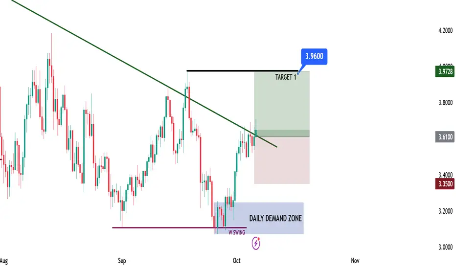 Position entered after 4H trendline break confirmation (two body closes above). Entry taken around $3.61, aligning with HTF bullish bias and demand confluence.