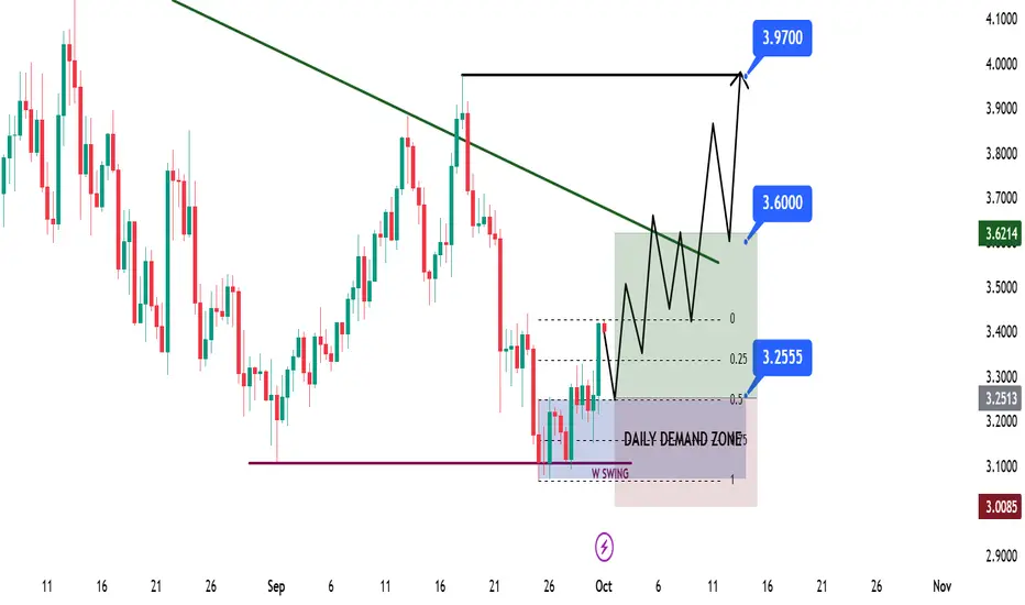 Currently, price is rejecting from the bearish LTF trendline above, which remains a key resistance. A retest of the confluence at 3.25$ (Daily Demand + Discount Zone) offers a strong setup for continuation higher.