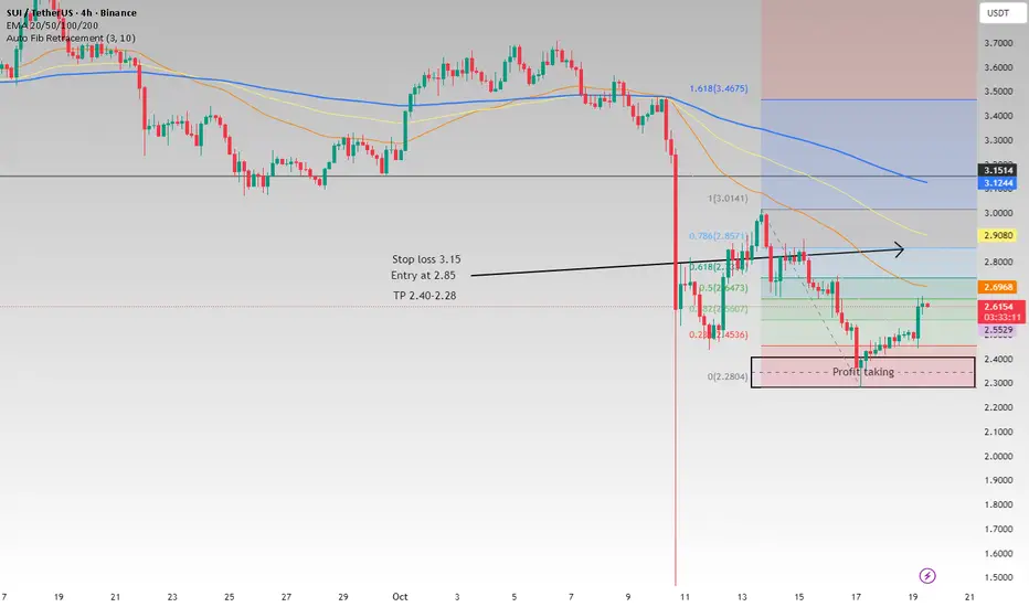 The setup fades a rebound into midrange supply beneath a declining moving‑average ribbon, leaning on mean‑reversion while the broader alt market stays capped under higher‑timeframe resistance.