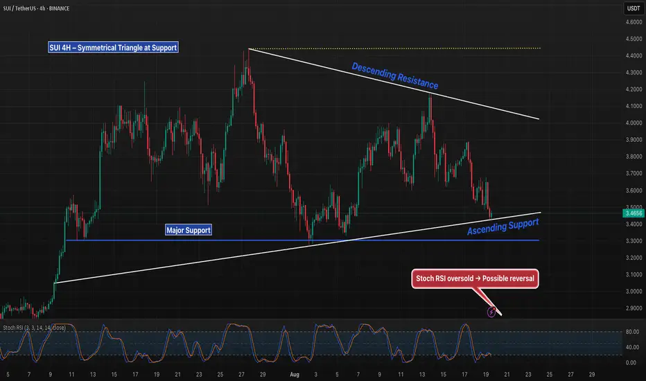 SUI is consolidating inside a symmetrical triangle with price pressing against ascending support around 3.35. Momentum is oversold on the 4H Stoch RSI, suggesting a potential reversal attempt.